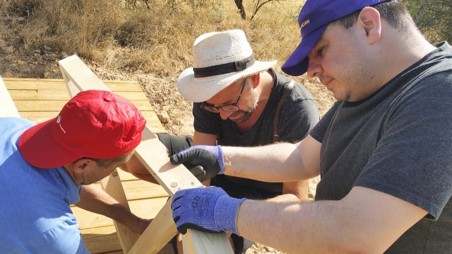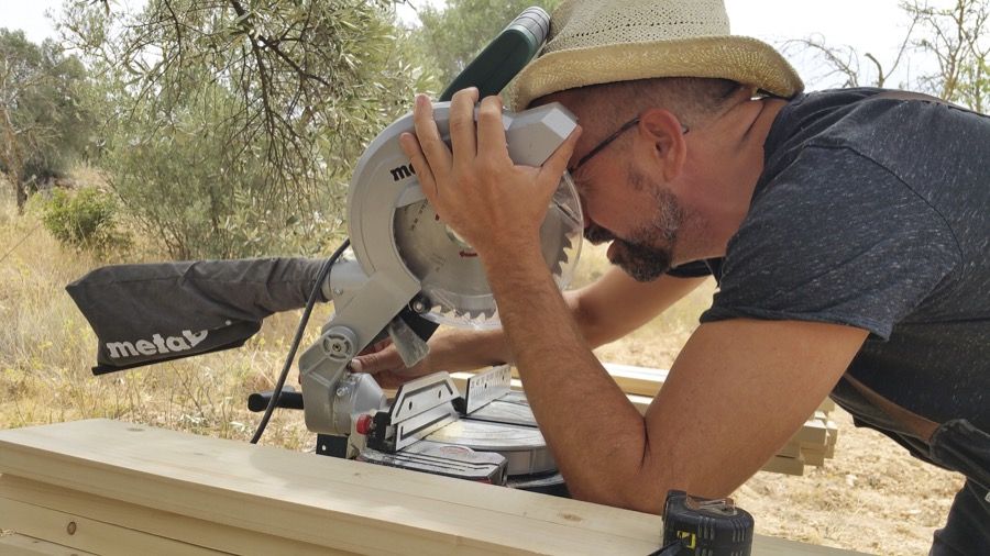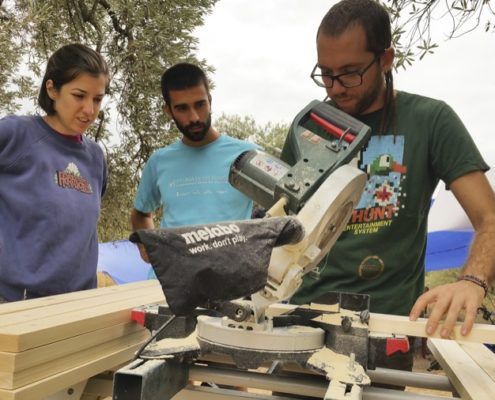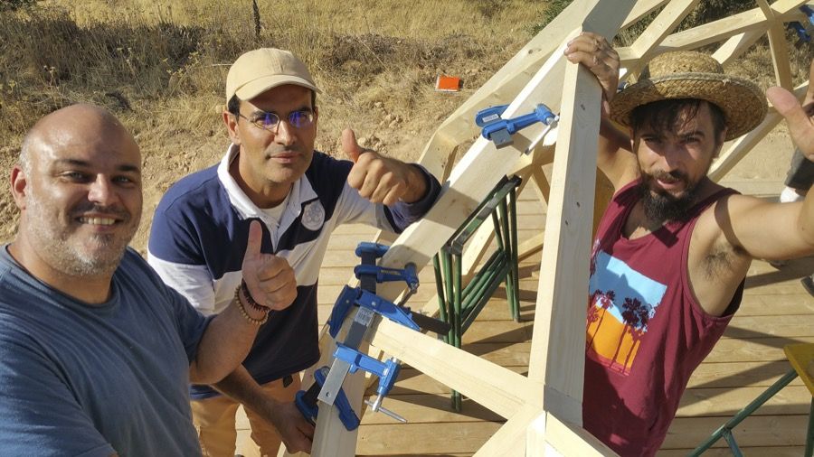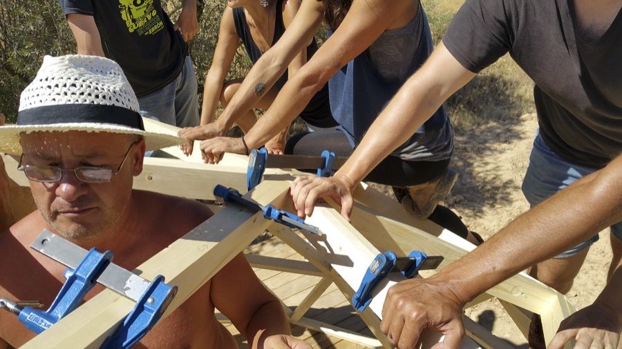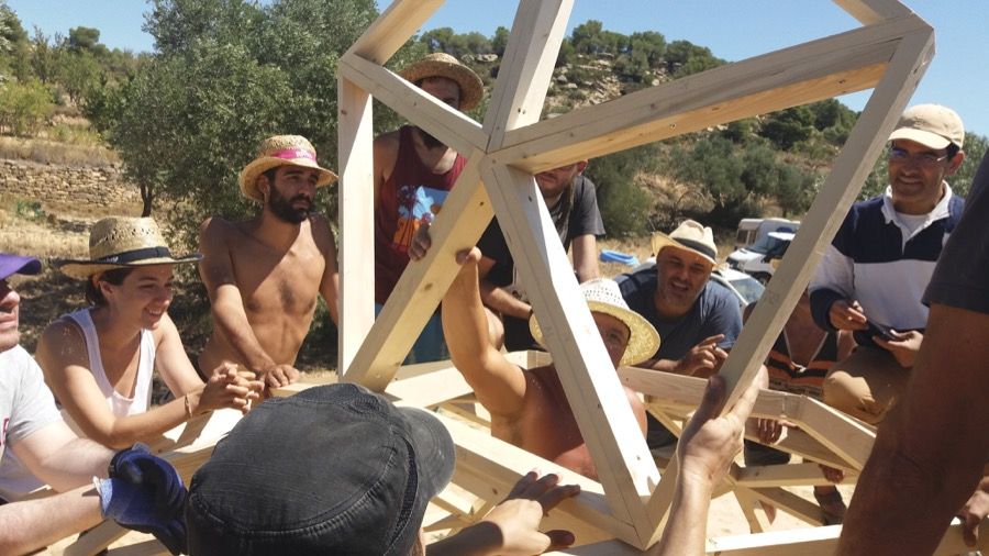 Inmersos en un paraje mediterráneo de olivares, bajo el sol de julio, hemos construido este fin de semana un domo geodésico de 5 metros de diámetro.