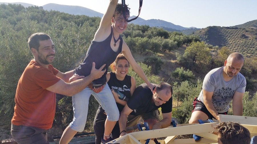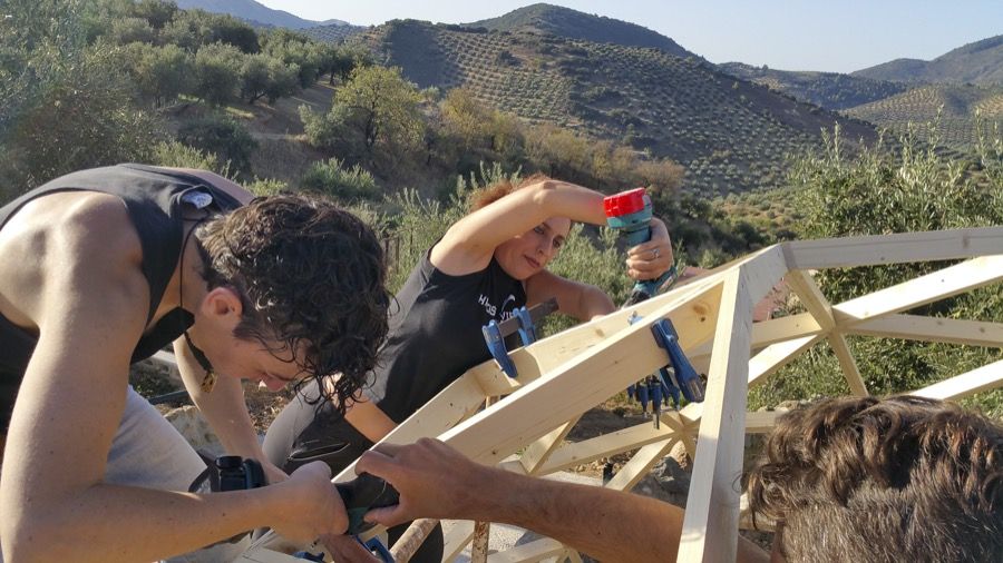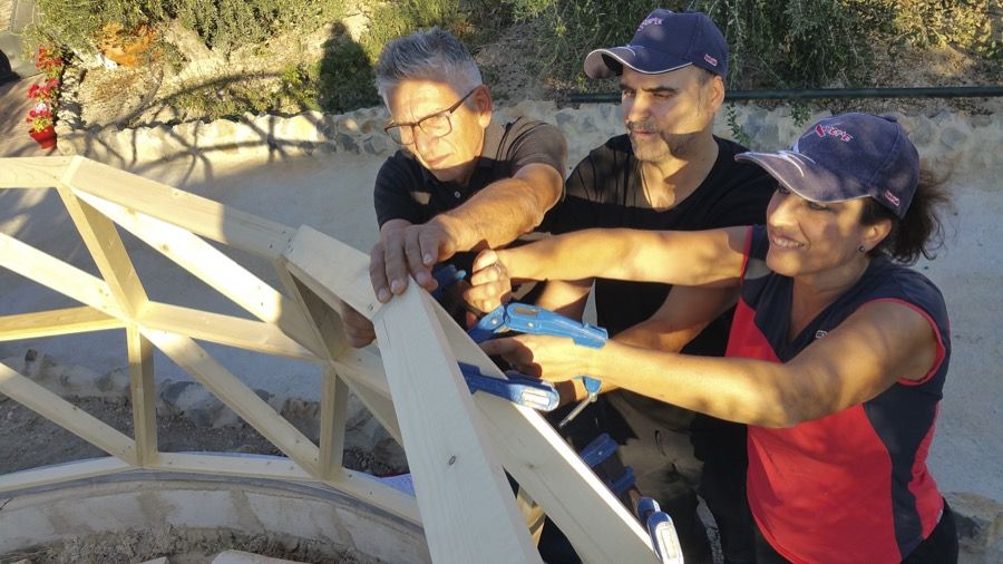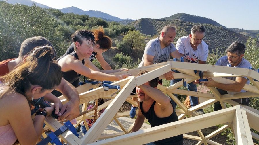 En un pintoresco lugar, rodeados de aparejos y antigüedades que el anfitrión ha ido recogiendo a lo largo de los años, y artilugios y maquinaria de agricultura que él mismo ha diseñado, hemos construido este fin de semana un domo de 5 metros de diámetro, que servirá como cubierta de invierno para la piscina circular de impresionantes vistas que corona la montaña de olivos.