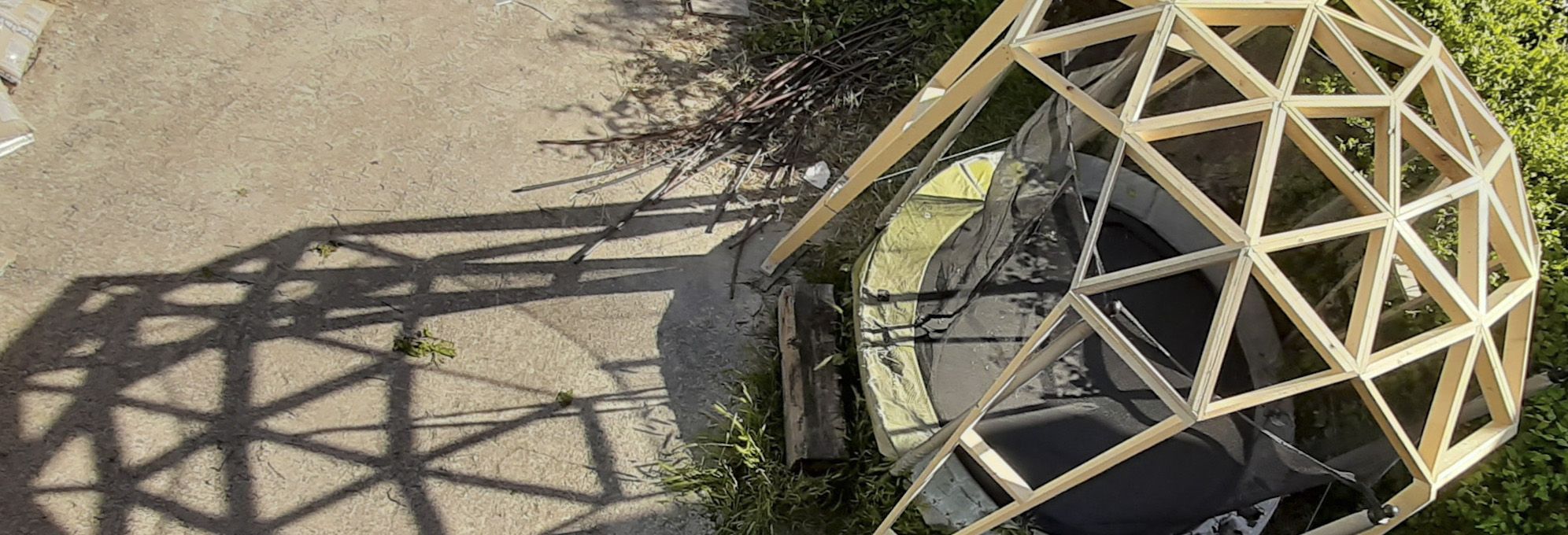 A falta de la lona que estamos confeccionando para dar sombra a esta cama elástica y que los niños no paren de saltar en verano, os presento esta pérgola geodésica que puede tener usos diversos dependiendo de su tamaño, como por ejemplo un cenador…