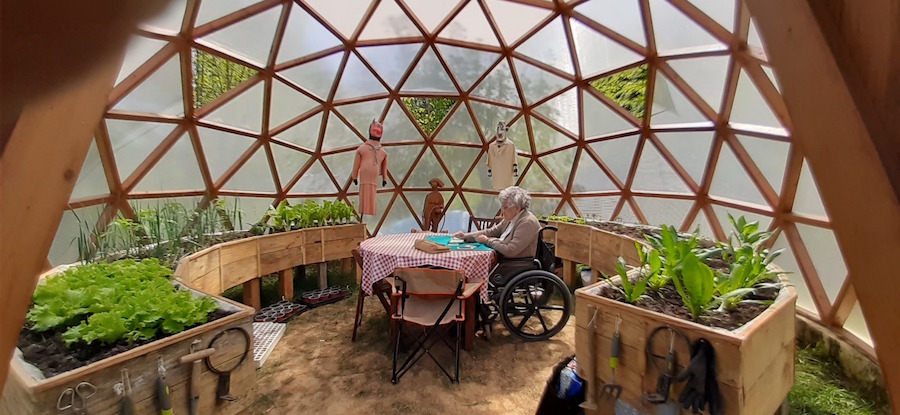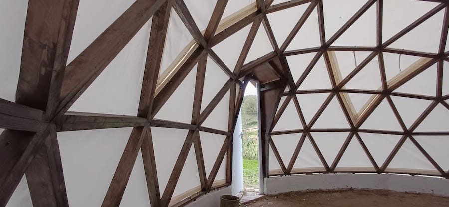 En su momento protegieron la madera con lasur y cubrieron el domo con lona de polietileno reforzada con malla transparente, lo que lo ha mantenido en buen estado casi cinco años. Ahora ha sido necesario renovar la envoltura de plástico y han puesto esta lona termosellada a medida.
