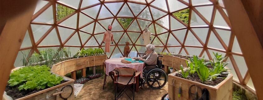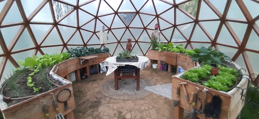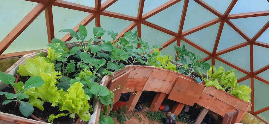Este es el domo invernadero de nuestros queridos amigos Nerea y Carlos. La estructura geodésica resultó de un entrañable curso que impartimos en su terreno en 2020 (puedes ver las fotos pinchando aquí) y ya lleva varios años a plena producción de cultivo ecológico de tomates, pimientos y otras delicias ¡con las que cocinan un pisto más que delicioso!.